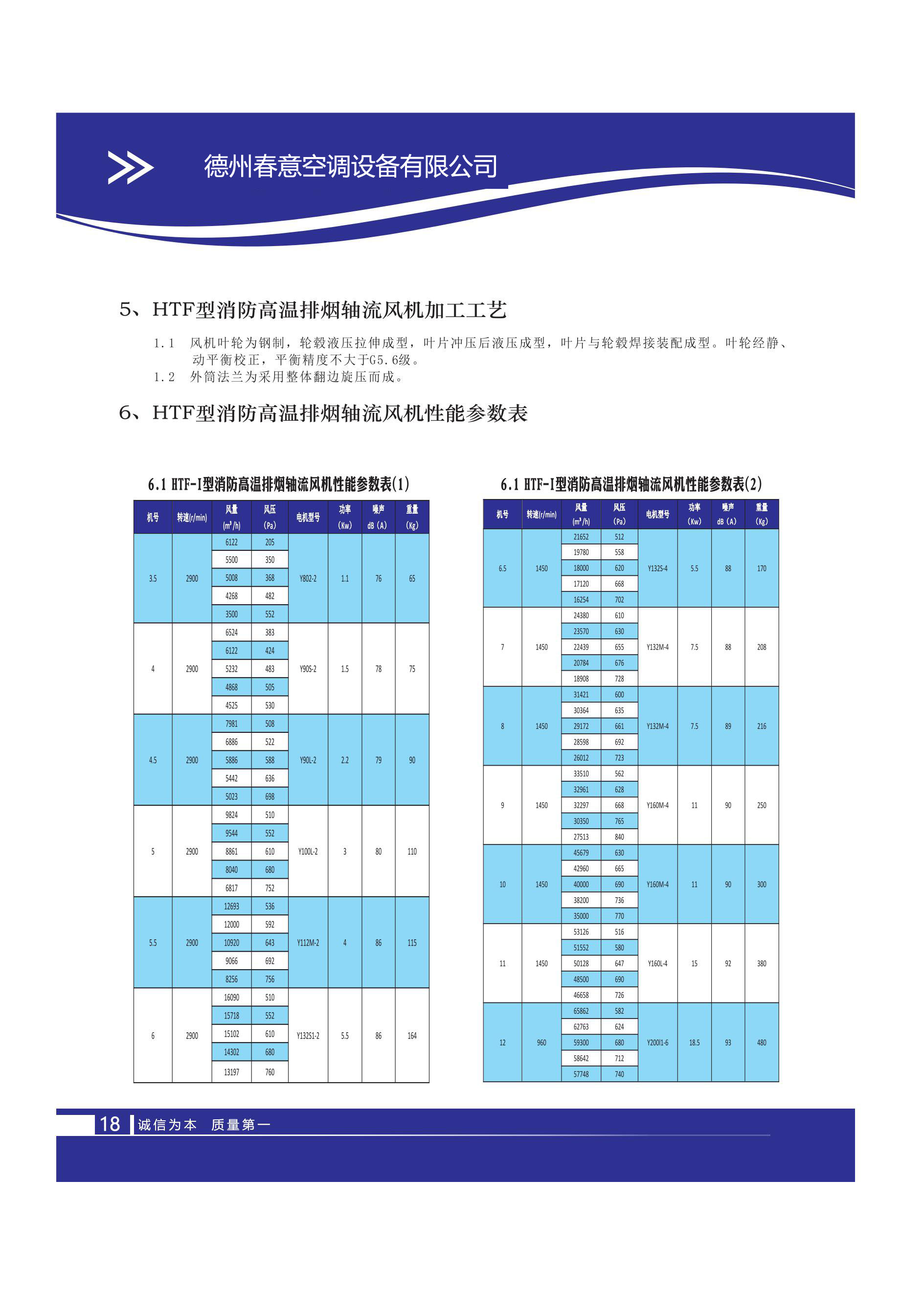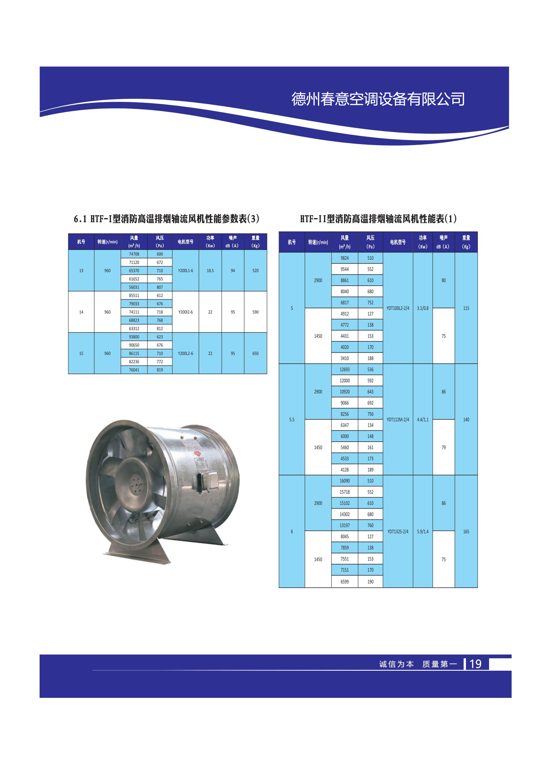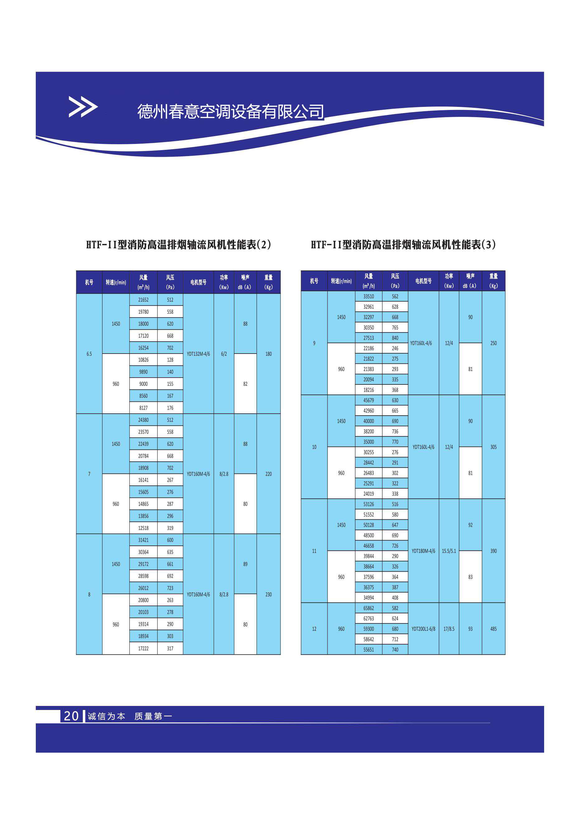 德州春意空調設備有限公司的 HTF - II 型消防高溫排煙軸流風機性能表(2)和(3),涵蓋了機號 6.5 至 12 的風機在不同轉速(如 1450/min、960/min)下的關鍵參數,包括風量(范圍從 7127m3/h 到 65862m3/h)、風壓(128Pa 至 840Pa)、電機型號(如 YDT132M - 4/6、YDT200L1 - 6/8)、功率(部分標注為 12/4Kw 等)、噪聲(80dB (A) 至 93dB (A))以及重量(180Kg 至 485Kg),體現了該系列風機的性能差異與規格特點。